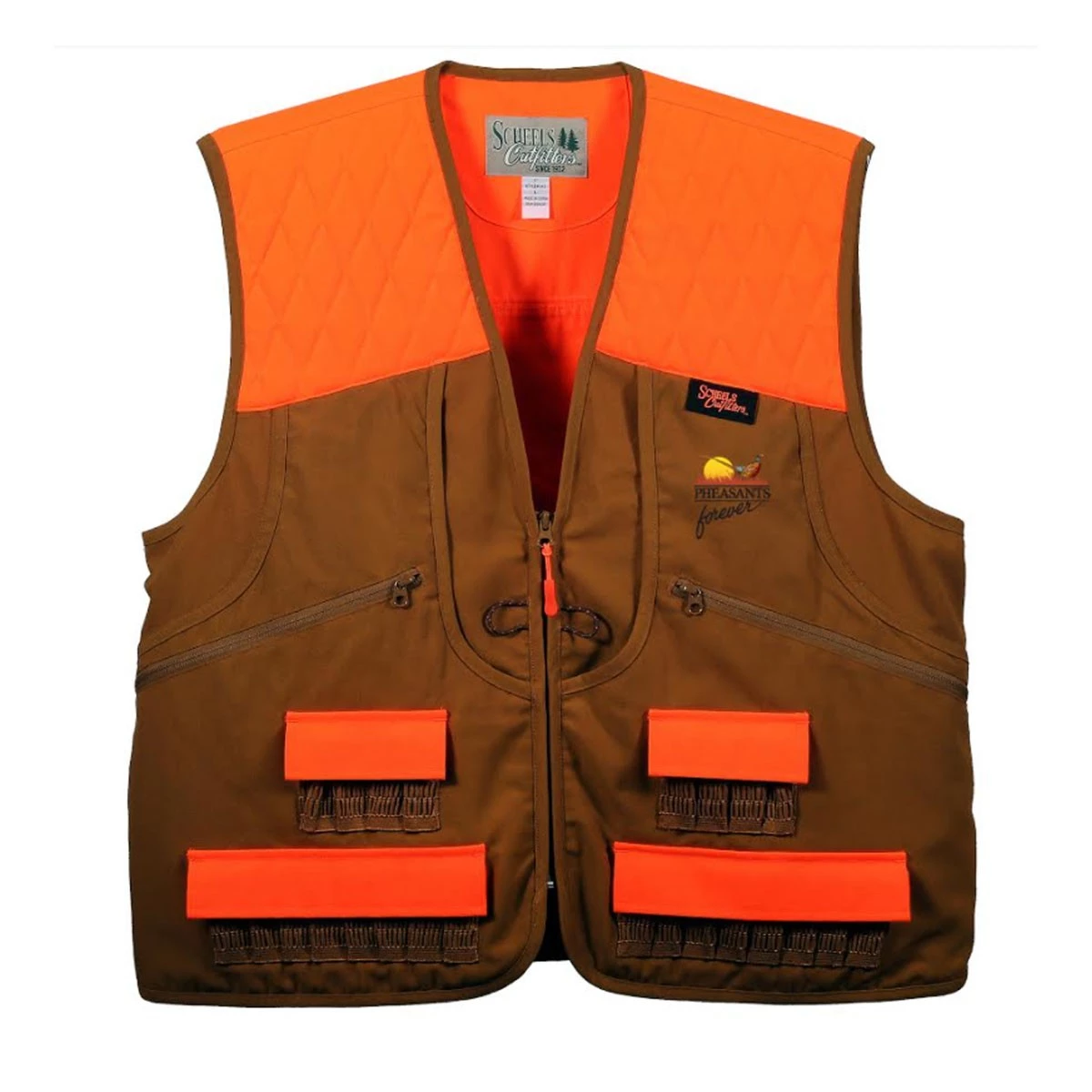 The Adult SCHEELS Outfitters Upland Vest is a versatile hunting vest that will last for seasons to come. This blaze orange hunting vest features a front-loading game bag for carrying pheasants, grouse, quail, and other small game birds. Elastic shell loops provide accessible storage for your shotgun ammo, while zippered front pockets offer convenient storage for gear like water bottles, gloves, and more. Plus, this SCHEELS upland vest has padded shooting shoulders that reduce fatigue and keep you comfortable shot after shot. Available in marsh brown with orange accents or solid blaze orange, the Adult SCHEELS Outfitters Upland Vest is built to last and has a host of convenient features.