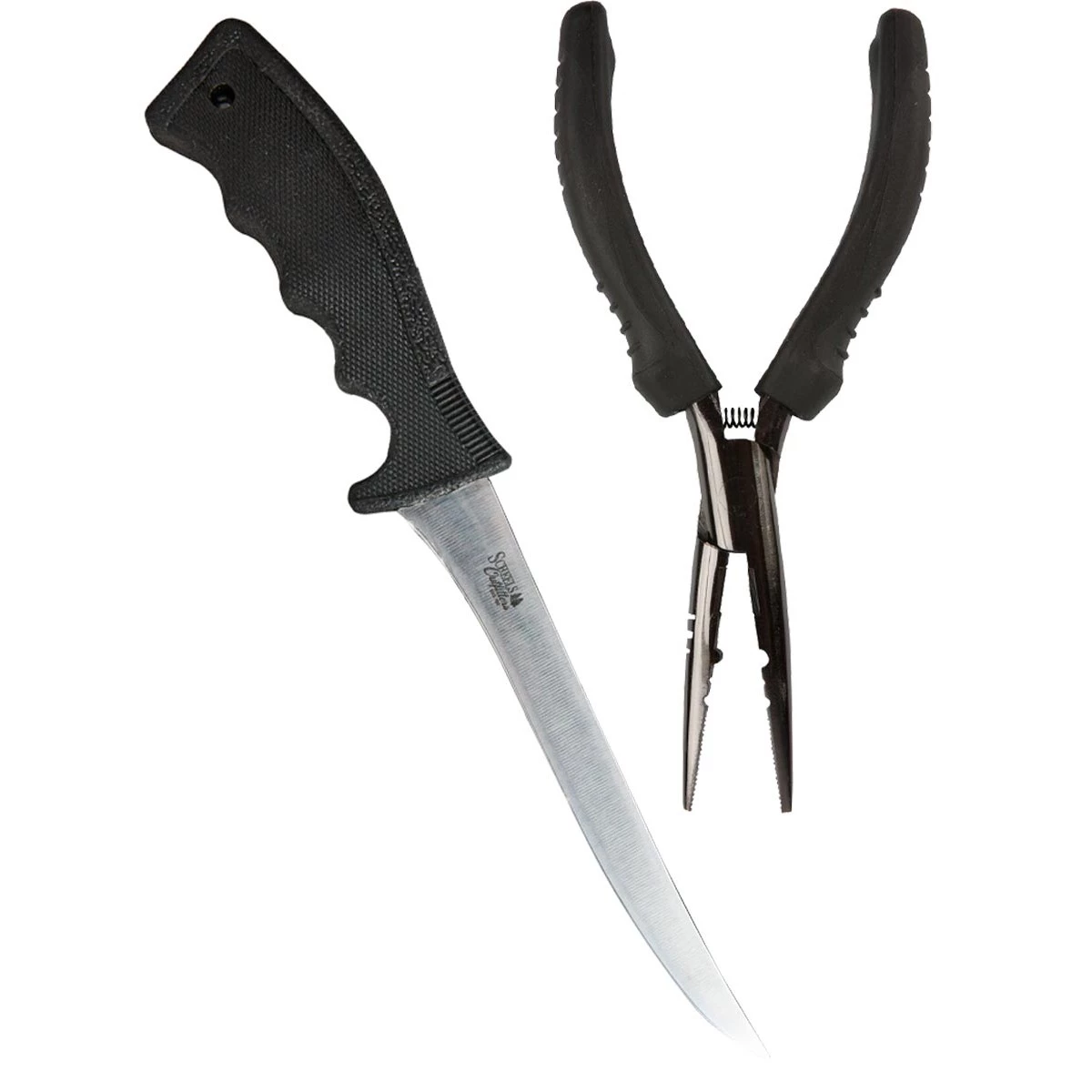 This Scheels Outfitters tool pack brings together two of a fisherman’s necessities: 6″ carbon steel pliers and 6″ soft-grip fillet knife.