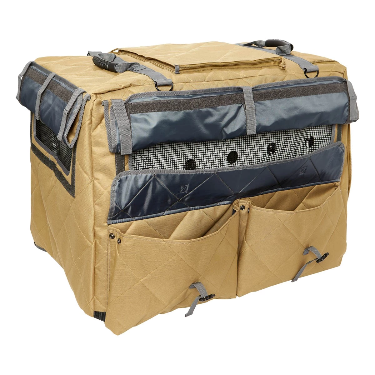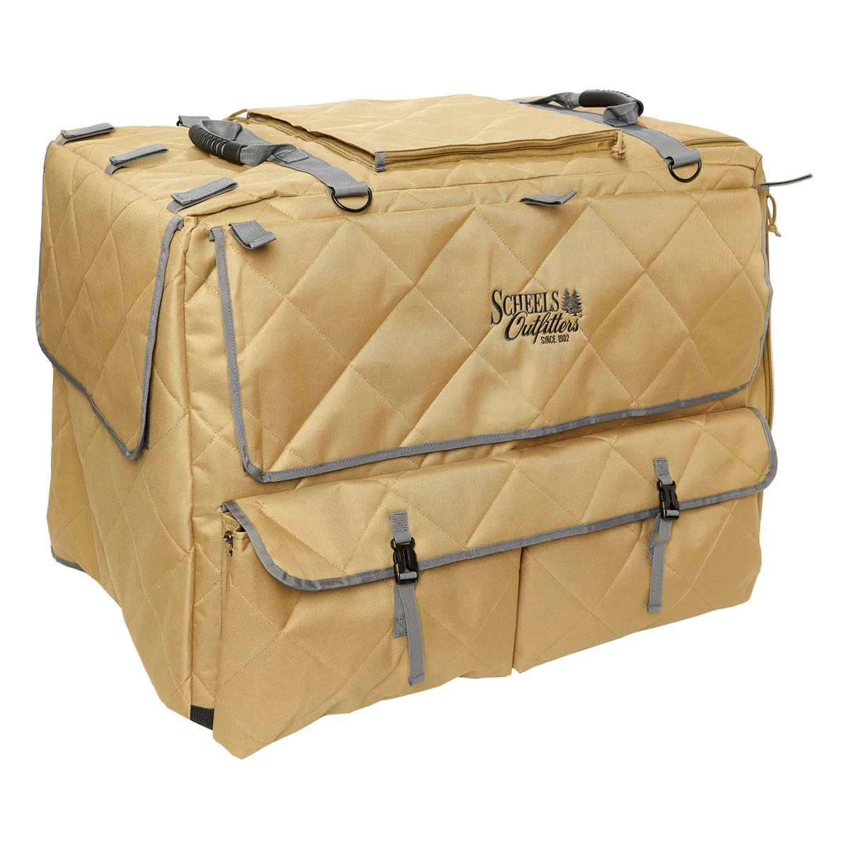 The Scheels Outfitters Kennel Cover 22 is specifically designed to fit roto-molded kennels as well as most standard kennels. Made to help trap and retain heat, the Scheels Outfitters Kennel Cover will keep your dog protected for chilly days and also reduce wind noise. When the temperatures are a bit milder, the zippered front flap and side windows help provide plenty of circulation. Additional features like the side bellow pockets with buckles and training supply pockets make for convenient storage. Make sure your pup is safe and comfortable with the Scheels Outfitters Kennel Cover 22.