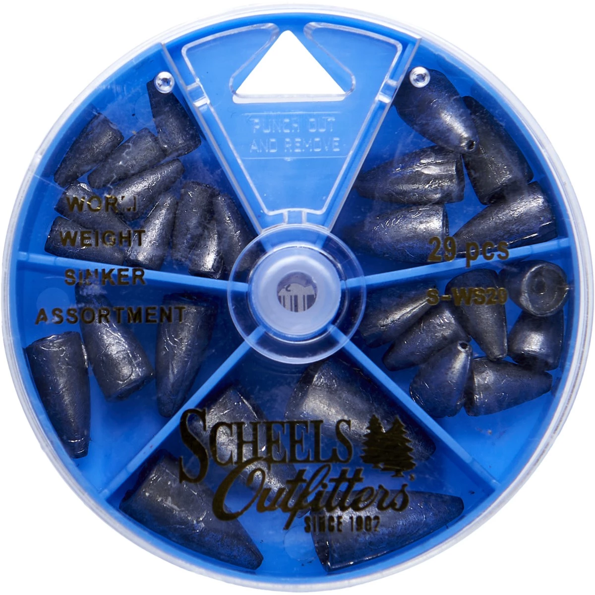 The SCHEELS Outfitters Worm Weight Sinker Dial Box contains five different sizes of worm weights. Worm weights are great for fishing with soft plastics and allow your bait to move through vegetation and weed beds while reducing the chance of snags. The radial box included with these worm weights allows you to keep your tackle box organized, and can be used as a storage container for other terminal tackle. The SCHEELS Outfitters Worm Weight Sinker Dial Box is a must-have for anglers who fish with soft plastics.